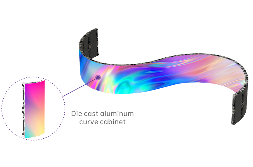 最大45°までの曲げ加工が可能なLEDパネルは大画面でも継ぎ目が目立たず、CNC加工によるダイカストアルミフレームで完璧な曲線を実現。