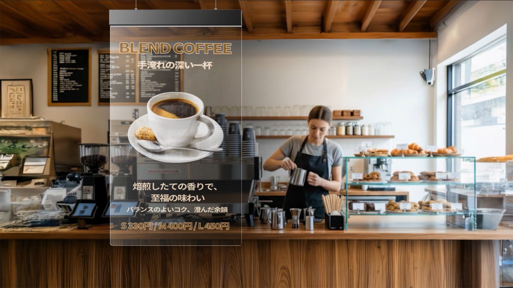 施工性に優れ、取付方法も自立や天吊りなど柔軟な設置が可能で、デザイン性の高い店舗向けの広告として、新しい空間を提供します。