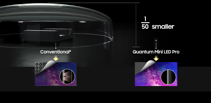 *従来型LEDとは、サムスンのQ8Fテレビモデルで使用されているものを指します。* サイズ比較は高さのみを基準とし、1:50スケールで表示しています。
