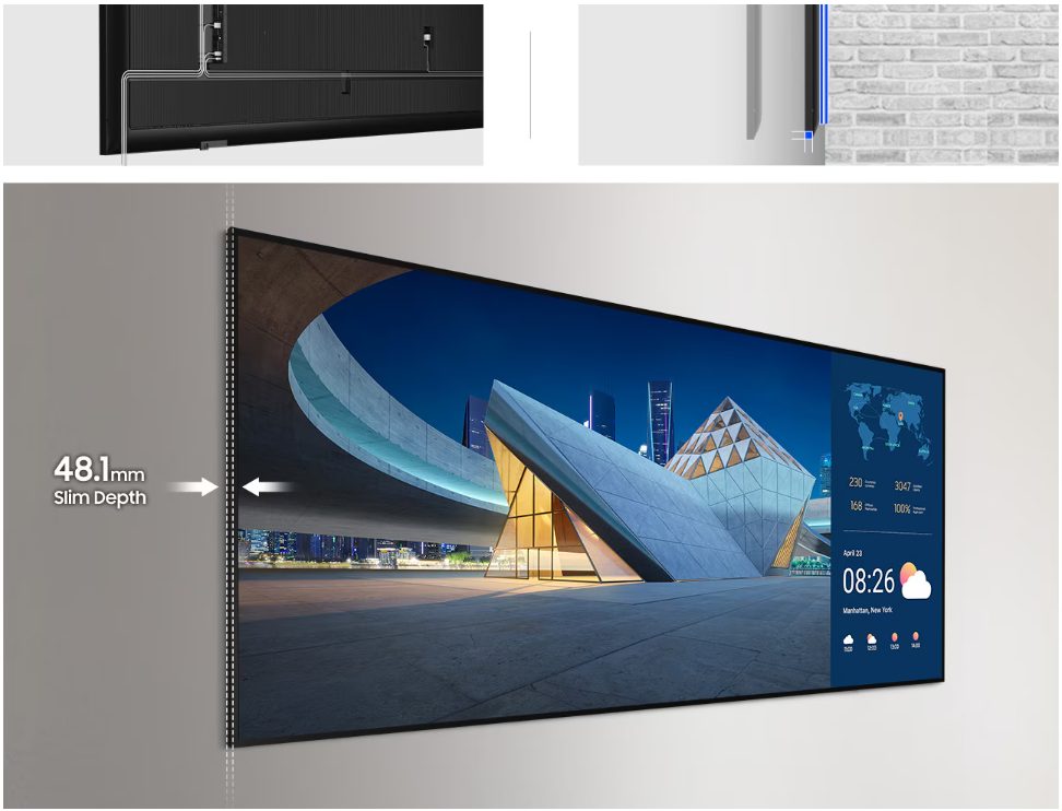 パフォーマンスとスペースの両方を最大化する洗練されたデザインで作業空間を引き上げましょう。奥行きはわずか48.1mmで、この105インチディスプレイは驚くほどスリムです。外向きのポートは壁掛けが簡単にできるためエレガントさと効率性の両方を求める会議室に最適です。